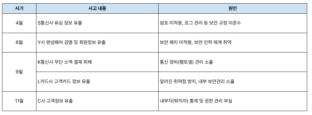 대형 침해사고가 촉발한 정책 전환 [표 1] 2025년 대형 침해 사고 [출처: 제2차 정보호호 종합대책안(2026.01)]