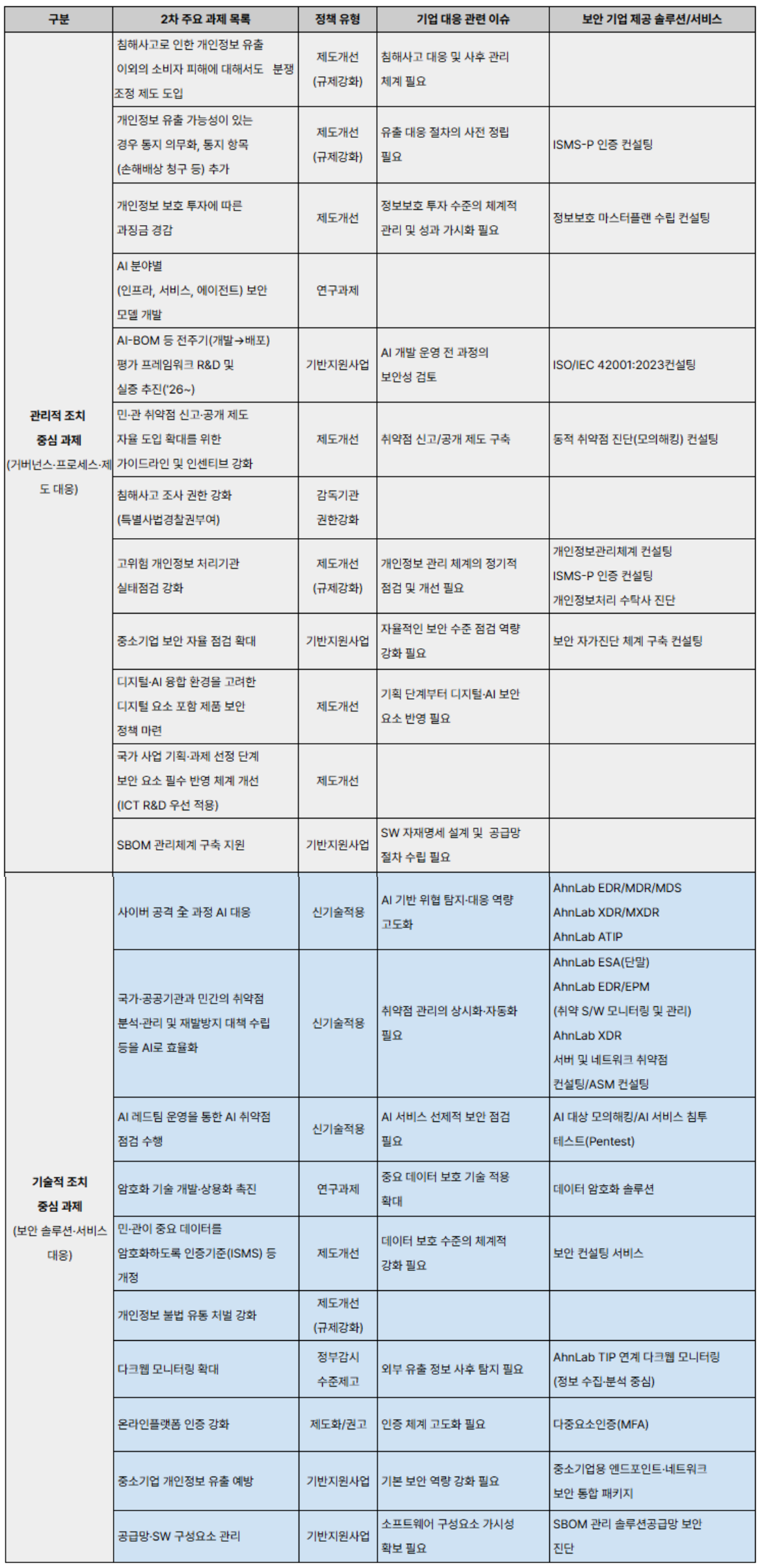 이러한 구조적 문제는 AI 기반 공격 자동화가 본격화되면서 더욱 심각한 리스크로 확대되고 있다. 정부는 침해사고 신고 건수가 2017년 287건에서 2024년 1,887건으로 급증했으며, AI가 취약점 탐색과 공격 실행 비용을 낮추면서 공격자 우위 환경이 강화되고 있다고 분석했다. 변화의 핵심 1: 기업 책임과 소비자 피해 구제가 강화된다 이번 대책에서 가장 큰 변화는 침해사고 발생 시 기업 책임 범위가 개인정보 유출에 국한되지 않고, 소비자 피해 전반으로 확대된다는 점이다.정부는 개인정보 유출 외의 침해사고 피해에 대해서도 분쟁조정 제도를 도입하는 방안을 추진하고 있으며(정보통신망법 개정, 2026년), 이는 사고 발생 이후 기업이 부담해야 할 법적·재무적 리스크가 크게 증가할 수 있음을 의미한다. 또한 기존에는 “유출 사실을 인지한 경우”에만 통지가 의무였으나, 앞으로는 유출 가능성이 있는 경우에도 조기 통지가 요구된다. 통지 항목에는 손해배상 청구, 분쟁조정 신청 등 소비자 대응 정보까지 포함될 예정이다. 이는 기업이 사고 대응을 기술적 복구 수준에서 끝낼 수 없으며, 소비자 보호 프로세스까지 포함한 체계적 IR(Incident Response) 운영이 필수 요건으로 자리잡고 있음을 보여준다. 변화의 핵심 2: 보안 투자 수준이 제재 수준을 결정한다 이번 종합대책은 규제 강화와 동시에 투자 유인 구조를 포함하고 있다. 정부는 개인정보보호법상 안전조치 의무 수준을 넘어서는 인력·예산·설비 투자를 수행한 기업에 대해 과징금 경감을 추진하고 있다. 이는 컴플라이언스가 단순히 최소 요건 충족 여부가 아니라, 기업의 보안 투자 성숙도가 직접적인 평가 요소가 되는 방향으로 이동하고 있음을 의미한다. 앞으로 정보보호는 비용이 아니라 경영 리스크 관리와 투자 판단의 핵심 지표로 재정의될 가능성이 높다. 변화의 핵심 3: AI 기반 공격 시대, AI 기반 대응이 요구된다 정부는 AI를 활용한 공격 자동화에 대응하기 위해 민간·공공의 위협 탐지·대응 시스템을 AI 기반으로 전환하겠다고 밝혔다. 또한 AI 서비스와 에이전트 환경에서 발생할 수 있는 모델 오염, 업데이트 위조, 중요정보 유출 등의 위협을 식별하기 위해 AI 분야별 보안 모델을 개발하고, AI 레드팀 운영을 통한 모의침투 테스트를 본격화할 예정이다. 기업 입장에서는 AI 기반 SOC, XDR 등 지능형 탐지·대응 체계가 중장기 컴플라이언스 대응의 필수 기반이 될 전망이다. 정책 변화에 따른 기업 대응 방향: 컴플라이언스 요구사항과 보안 대응 과제 정리 이번 「제2차 정보보호 종합대책」은 정보보호를 단순한 규제 준수(compliance) 차원의 관리 항목이 아니라, 침해사고를 예방하고 법적·재무적 책임을 최소화하기 위한 핵심 경영 요소로 기업 내부에 내재화할 것을 요구하고 있다. 이에 따라 기업의 정보보호 체계는 사고 발생 이후 대응에 초점을 둔 구조에서 벗어나, 사전 예방과 상시적인 위험 관리를 중심으로 한 보안 운영 모델로의 전환이 불가피해지고 있다. 특히 소비자 보호 의무 강화, 침해사고 통지 책임 확대, AI 기반 공격 고도화, 중요 데이터 보호 요구, 제품 보안(Security by Design) 및 공급망 보안 강화 등 복합적인 정책 변화가 동시에 추진됨에 따라, 기업은 보안 거버넌스, 기술적 통제, 운영 프로세스를 포괄하는 종합적인 대응 체계를 선제적으로 마련할 필요가 있다. 이러한 관점에서 [표 2]는 주요 정책 변화에 따라 기업이 준비해야 할 대응 과제를 관리적 조치와 기술적 조치로 구분하고, 이를 지원하기 위해 보안 기업이 제공할 수 있는 솔루션 및 서비스 영역을 정리한 것이다. ![]() [표 2] 주요 정책 변화에 따른 기업 대응 과제: 관리적 조치 vs 기술적 조치 예시 ※ 본 표는 정책 과제의 성격에 따라 관리적·기술적 조치를 구분해 정리하였으며, 하나의 정책 과제가 두 영역을 동시에 요구하는 경우에는 이를 각각 제시하였다. ※ 본 표는 정책 요구사항을 기준으로 한 대표적 대응 솔루션의 예시이며, 산업별 환경에 따라 적용 솔루션은 달라질 수 있다. 컴플라이언스 대응을 위한 안랩(AhnLab) 보안 체계 적용 방안 「제2차 정보보호 종합대책」은 기업이 침해사고 예방과 책임 최소화를 위해 기술적 통제 수단뿐 아니라, 운영 프로세스와 거버넌스를 포함한 정보보호 체계를 종합적으로 구축할 것을 요구하고 있다. 특히 소비자 보호 의무 강화, AI 기반 공격 고도화, 중요 데이터 암호화 확대, 취약점 관리 체계 정비 등 정책 요구사항이 동시에 강화됨에 따라, 기업은 개별 솔루션 중심의 대응을 넘어 통합적인 보안 체계 관점에서 대응 전략을 수립할 필요가 커지고 있다. 이러한 환경에서 안랩은 보안 컨설팅 서비스를 기반으로, 위협 탐지·대응(XDR/MXDR), 위협 인텔리전스(TIP), 취약점 및 공격표면 관리, 엔드포인트·네트워크 보안 등 주요 영역에서 정책 변화에 대응할 수 있는 보안 역량을 제공할 수 있다. [표 2]에 제시된 솔루션 및 서비스는 이러한 정책 요구사항에 대응하기 위한 대표적인 적용 예시로, 실제 적용은 기업의 산업 특성과 보안 환경에 따라 달라질 수 있다. 정보보호는 ‘규제 대응’이 아니라 ‘기업 생존 조건’으로 