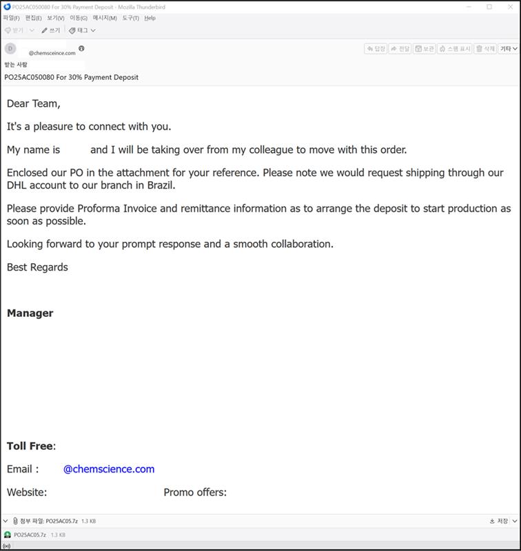 내용 | 최근 안랩은 견적서 요청을 위장한 피싱 메일을 통해 유포되는 다크클라우드(DarkCloud) 악성코드를 확인했다. 공격자는 배송 견적서로 위장한 메일과 함께 압축 파일을 첨부해 수신자가 열람하도록 유도한다. 사용자가 내부의 난독화된 스크립트(.js)를 실행하면 C2 서버에서 다크클라우드가 다운로드돼 정상 프로세스에 은밀히 침투하고, 패스워드, 신용카드 정보, 암호화폐 지갑 데이터 등 민감한 정보를 탈취한다. 메일을 열람하기만 해도 치명적인 피해로 이어질 수 있는 만큼, 이번 공격 기법과 대응 방안을 살펴보자.![]() ![]() [그림 1] 피싱 메일 본문