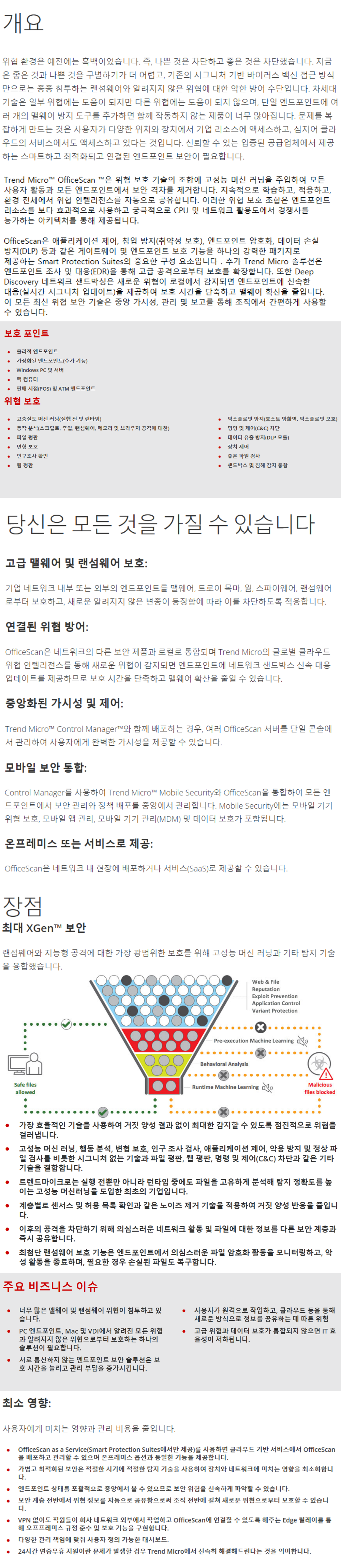 Trend Micro™ OfficeScan ™은 위협 보호 기술의 조합에 고성능 머신 러닝을 주입하여 모든 사용자 활동과 모든 엔드포인트에서 보안 격차를 제거합니다. 지속적으로 학습하고, 적응하고, 환경 전체에서 위협 인텔리전스를 자동으로 공유합니다.