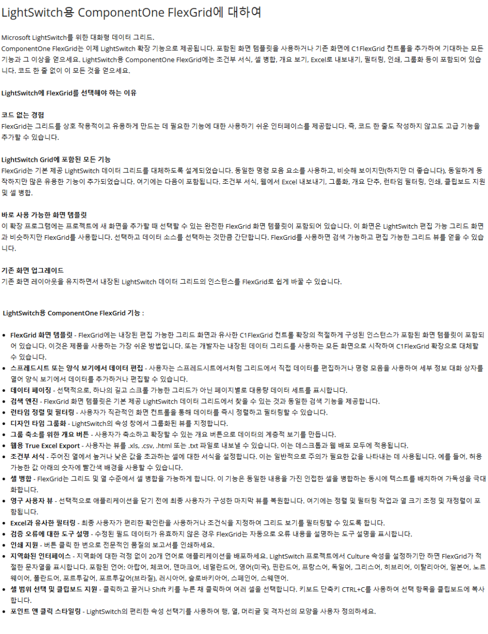 LightSwitch용 ComponentOne FlexGrid ComponentOne FlexGrid는 이제 LightSwitch 확장 기능으로 제공됩니다. 포함된 화면 템플릿을 사용하거나 기존 화면에 C1FlexGrid 컨트롤을 추가하여 기대하는 모든 기능과 그 이상을 얻으세요. LightSwitch용 ComponentOne FlexGrid에는 조건부 서식, 셀 병합, 개요 보기, Excel로 내보내기, 필터링, 인쇄, 그룹화 등이 포함되어 있습니다.