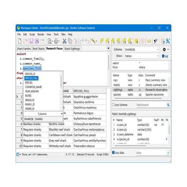 지원되는 클라이언트 운영체제: 터미널 서버/Citrix를 포함한 Windows 7 이상.Windows 11에 대한 지원이 향상되었습니다.버전 8의 새로운 기능Oracle 8 이상을 지원합니다. 전체 또는 즉시 작동하는 Oracle 클라이언트가 필요합니다.Oracle 23ai 지원버전 8의 새로운 기능취소 가능한 전체 페치와 클라이언트 측 정렬 기능을 갖춘 증분 페치 모드 옵션입니다.버전 8의 새로운 기능별칭 처리 및 조인 빌더를 포함하여 속도와 사용성이 개선된 SQLBuilder가 개선되었습니다.버전 8의 새로운 기능데이터베이스별 명령, 저장 프로시저 등을 포함한 SQL 쿼리 및 스크립트 실행여러 스크립트를 동시에 편집하고 실행합니다.상황에 맞는 강조 표시와 팝업 테이블/필드 목록이 있는 SQL 편집기.스키마 정보를 보고 쿼리와 스크립트에 쉽게 붙여넣을 수 있습니다.전치 모드, 정렬, 사용자 정의 서식, 필터링 등을 지원하는 매우 빠른 데이터 그리드입니다.전체 거래 제어를 통해 쿼리 결과를 편집합니다.여러 줄로 된 텍스트나 서식이 지정된 텍스트를 보기 위한 셀 세부 정보 창입니다.Jpg, Gif, Png, Bmp, Tif, MultiPage Tif 등을 지원하는 이미지 뷰어 셀 세부 정보 창입니다.내장된 SQL 포매터를 사용하여 SQL 명령문을 포맷합니다.데이터를 Excel, Calc, CSV, XML, 삽입 명령문 스크립트 등으로 내보냅니다. 내보내기는 명령줄 옵션을 사용하여 스크립팅하고 자동으로 실행할 수도 있습니다.COM 자동화를 통해 Excel 및 Open Office Calc로 내보냅니다.Excel이 설치되어 있지 않아도 Excel 파일(.xls, .xlsx)로 직접 내보낼 수 있습니다.PHP, JavaScript, C++, VB, Object Pascal 등과 같은 프로그래밍 도구와 통합하기 위한 언어 복사 및 붙여넣기 기능입니다.SQLPlus 변수 프롬프트, 바인드 변수(RefCursor 포함), 매개변수 전달을 통한 외부 스크립트 호출을 지원합니다.EXEC, DESC 및 CONNECT 문 지원.DBMS 출력 지원.대본과 진술의 타이밍.명령줄 옵션과 스크립트 명령을 사용하여 스크립트 실행을 자동화합니다.계획 출력을 설명합니다.SQLPlus 스타일 SPOOL 파일 지원.사용자 정의 가능한 도구 모음 및 단축키.인터넷 연결이 필요 없이 애플리케이션을 사용할 수 있고 읽기 전용 모드를 쉽게 설정할 수 있어 기업에 적합합니다.수백만 개의 레코드를 처리할 수 있는 정교한 별도의 가져오기/내보내기 애플리케이션(ImpExpLite)입니다.