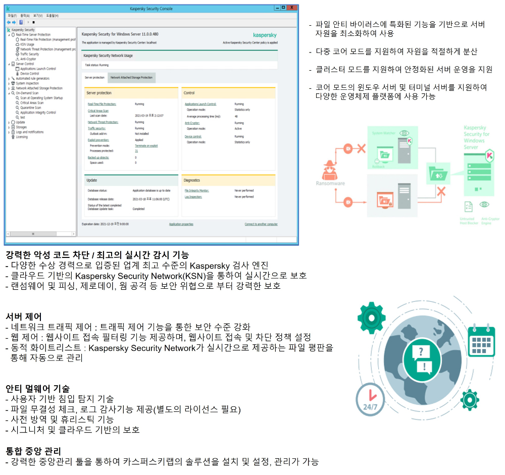 - 파일 서버용 안티 바이러스 프로텍션은 전체적인 규모의 정보 보호 시스템에서 아주 중요한 부분입니다. - 파일 서버 실시간 감시기 기능으로 네트워크로 유입되는 악성 코드를 실시간으로 차단할 수 있습니다.