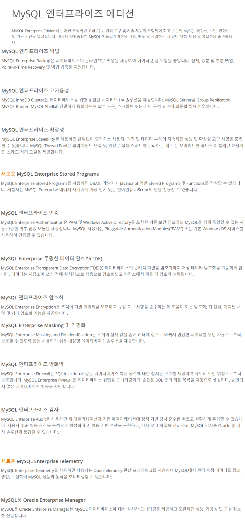 MySQL Enterprise Edition에는 가장 포괄적인 고급 기능, 관리 도구 및 기술 지원이 포함되어 최고 수준의 MySQL 확장성, 보안, 안정성 및 가동 시간을 달성합니다. 비즈니스에 중요한 MySQL 애플리케이션을 개발, 배포 및 관리하는 데 있어 위험, 비용 및 복잡성을 줄여줍니다.