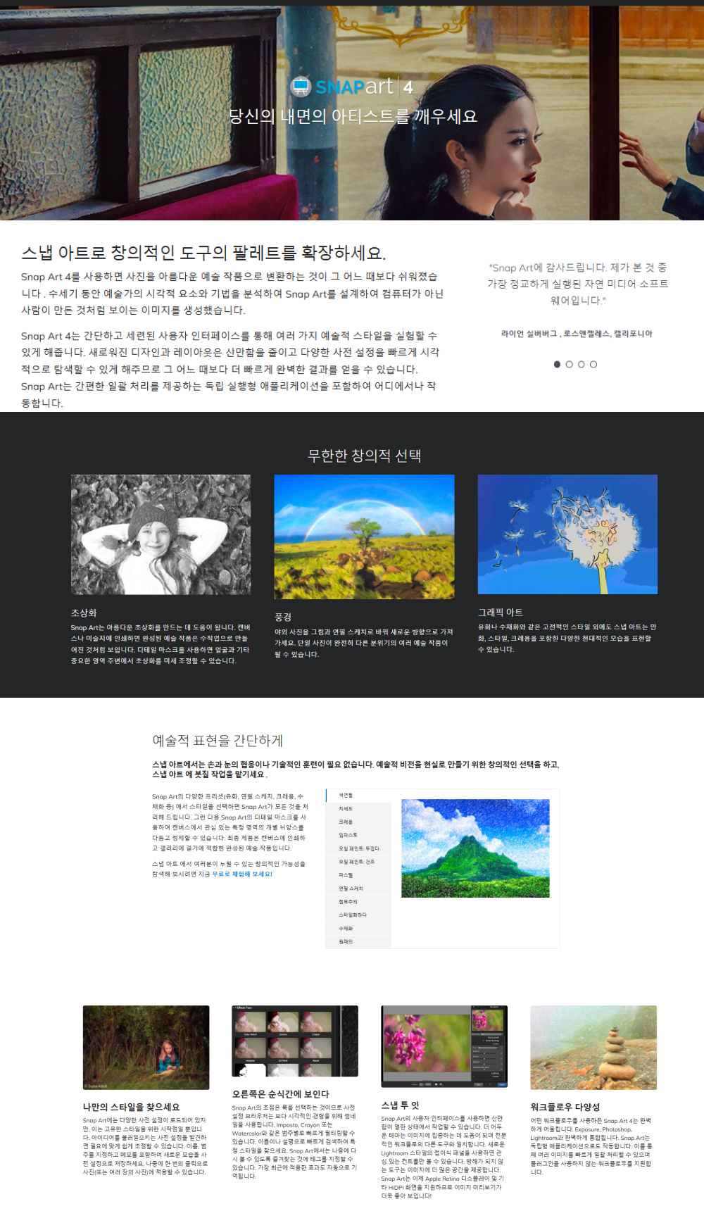 Snap Art 4를 사용하면 사진을 아름다운 예술 작품으로 변환하는 것이 그 어느 때보다 쉬워졌습니다 . 수세기 동안 예술가의 시각적 요소와 기법을 분석하여 Snap Art를 설계하여 컴퓨터가 아닌 사람이 만든 것처럼 보이는 이미지를 생성했습니다.Snap Art 4는 간단하고 세련된 사용자 인터페이스를 통해 여러 가지 예술적 스타일을 실험할 수 있게 해줍니다. 새로워진 디자인과 레이아웃은 산만함을 줄이고 다양한 사전 설정을 빠르게 시각적으로 탐색할 수 있게 해주므로 그 어느 때보다 더 빠르게 완벽한 결과를 얻을 수 있습니다. Snap Art는 간편한 일괄 처리를 제공하는 독립 실행형 애플리케이션을 포함하여 어디에서나 작동합니다.