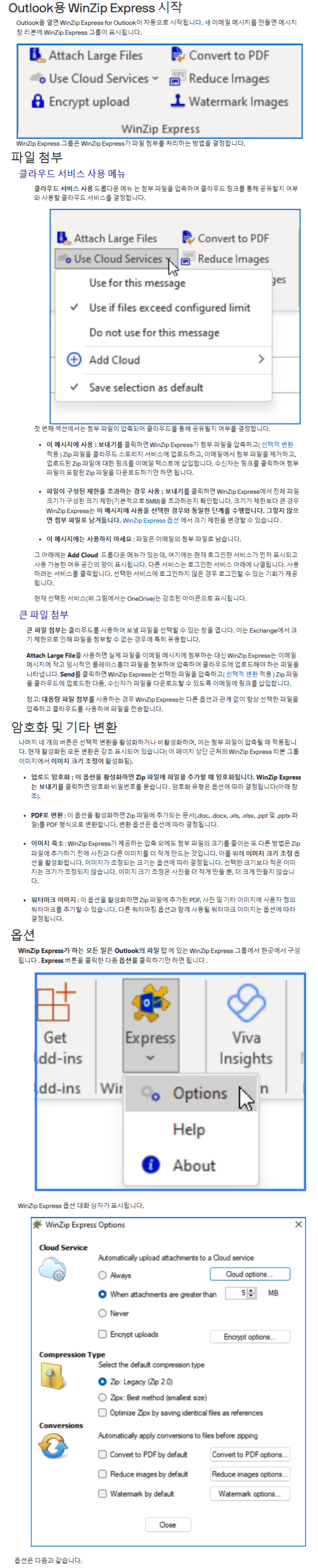 WinZip® Express for Outlook을 사용하면 첨부 파일을 Zip 파일로 압축하고, Zip 파일을 클라우드에 업로드하고, 이메일에 링크를 삽입하여 Outlook에서 직접 클라우드를 통해 파일을 쉽게 공유할 수 있습니다. 이메일 첨부 파일 크기 제한을 극복하고, 암호화로 추가 보안을 제공하며, Office 문서를 PDF로 변환하고, 이미지에 워터마크를 추가하고 크기를 조정할 수 있습니다.