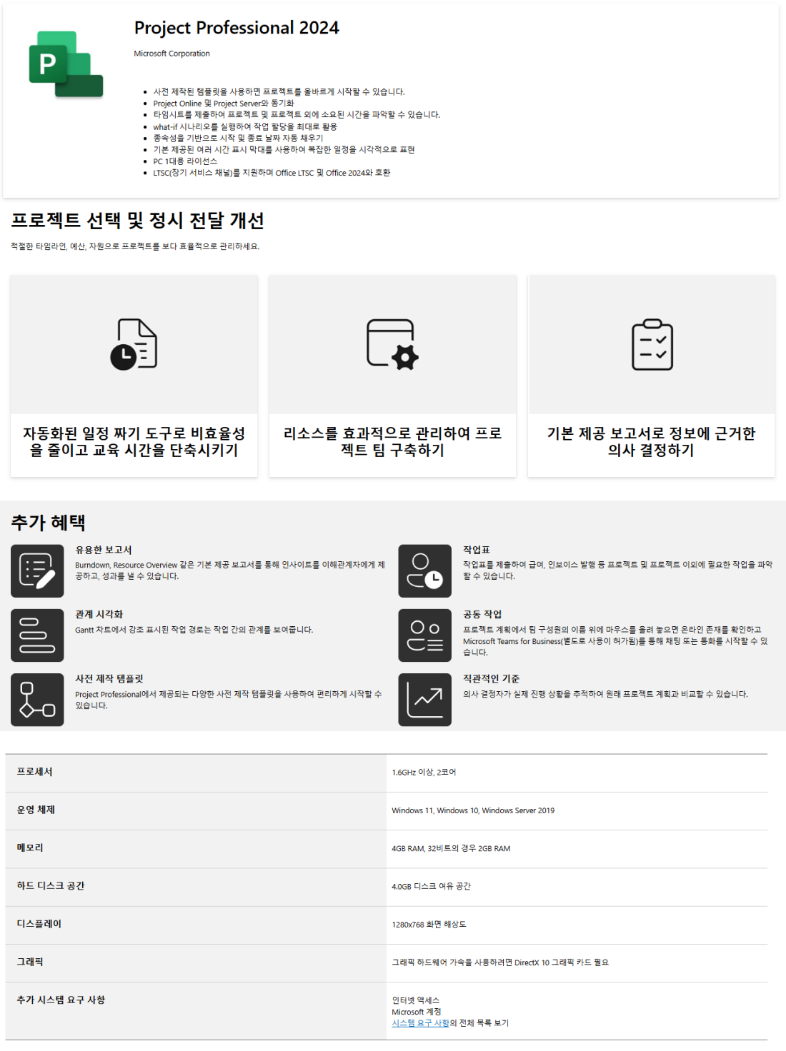 사전 제작된 템플릿을 사용하면 프로젝트를 올바르게 시작할 수 있습니다. -Project Online 및 Project Server와 동기화 -타임시트를 제출하여 프로젝트 및 프로젝트 외에 소요된 시간을 파악할 수 있습니다. -what-if 시나리오를 실행하여 작업 할당을 최대로 활용 -종속성을 기반으로 시작 및 종료 날짜 자동 채우기 -기본 제공된 여러 시간 표시 막대를 사용하여 복잡한 일정을 시각적으로 표현