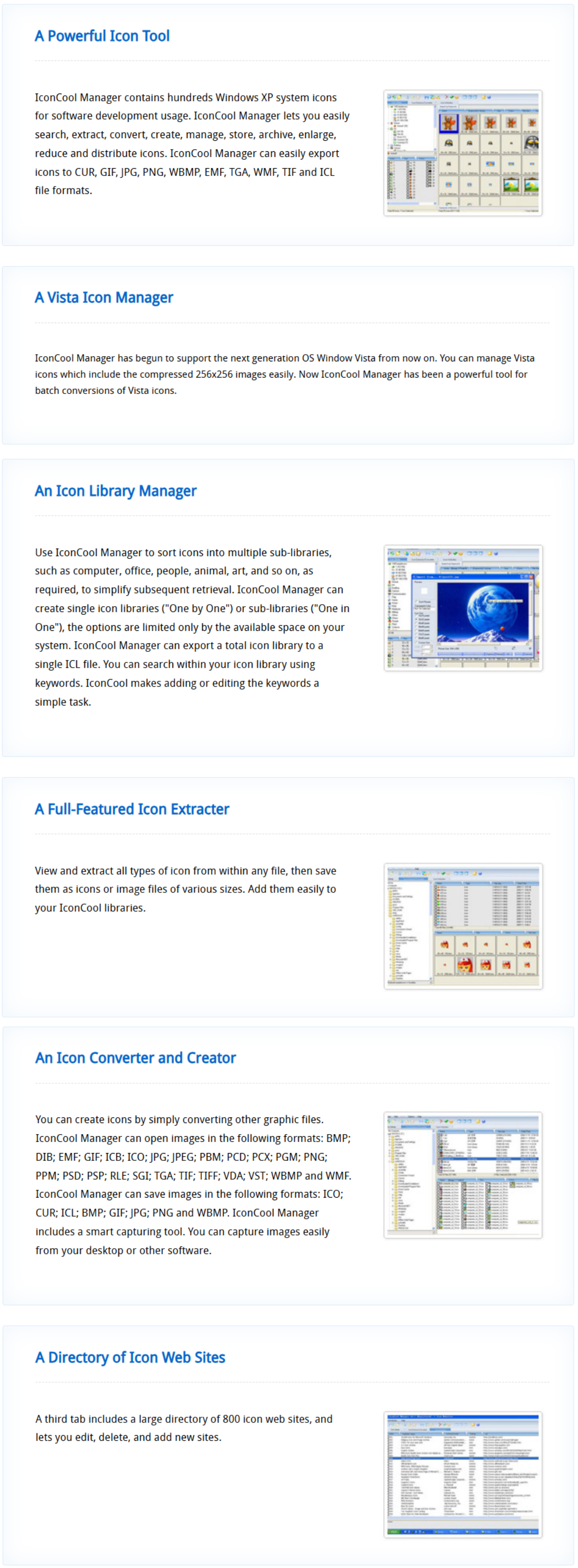 IconCool Manager is an ideal tool to manage, keep, modify, extract, convert, enlarge and contract icons. An icon library with dozens of sample entries is included and accessible through a tree-style organizational system, allowing you to categorize icons and create new classes and sublibraries within them.