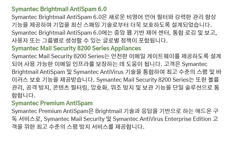 Symantec Brightmail AntiSpam은 최신 안티스팸 및 이메일 위협 차단 기능을 제공하는 솔루션입니다. 인터넷 게이트웨이에 설치되어, 다양한 테크놀로지와 전세계에 배치된 운영 센터, 독보적인 스팸 탐지 네트워크, 실시간 필터 전달 메커니즘 등을 통해 이메일의 보안 수준과 생산성을 개선할 수 있게 합니다. 주요 기능 95 퍼센트의 정확도로 스팸을 탐지 99.9999%의 스팸 탐지율(백만 분의 1보다 낮은 오탐지율) 5-10분 간격으로 최신 보안 정보 자동 업데이트 미국, 아일랜드, 호주, 대만의 글로벌 운영 센터를 통해 지원 주요 혜택 전세계 3억 이상의 사용자 환경을 지원하고 있는 업계 선두의 검증된 솔루션 Brightmail AntiSpam 솔루션은 전세계 이메일의 15 퍼센트 이상, 매달 1억 개 이상의 이메일을 필터링하는데 사용되고 있습니다. 미국 최상위 12개 ISP 업체가 Brightmail AntiSpam 솔루션을 이용하여 사용자 환경을 보호하고 있습니다. 미국, 아일랜드, 호주, 대만의 글로벌 운영 센터의 지원