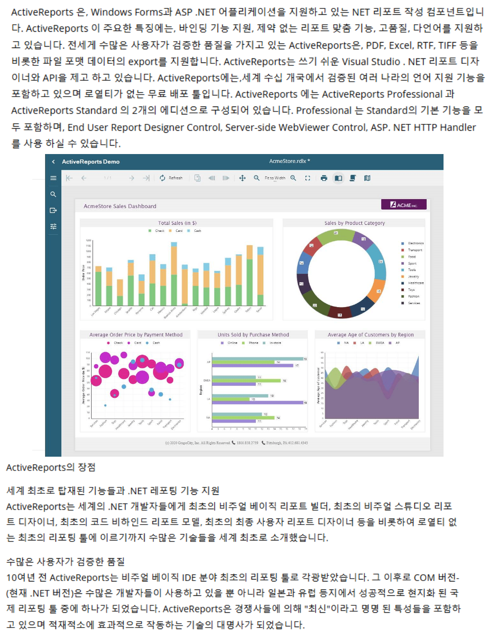 ActiveReports은 Windows Forms과 ASP .NET 어플리케이션을 지원하고 있는 NET 리포트 작성 컴포넌트입니다. ActiveReports 이 주요한 특징에는, 바인딩 기능 지원, 제약 없는 리포트 맞춤 기능, 고품질, 다언어를 지원하고 있습니다.