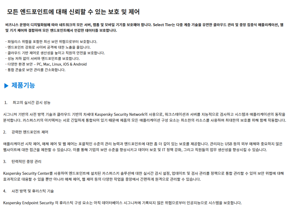 비즈니스 운영이 디지털화됨에 따라 네트워크의 모든 서버, 랩톱 및 모바일 기기를 보호해야 합니다. Select Tier는 다중 계층 기술을 유연한 클라우드 관리 및 중앙 집중식 애플리케이션, 웹 및 기기 제어와 결합하여 모든 엔드포인트에서 민감한 데이터를 보호합니다.파일리스 위협을 포함한 최신 보안 위협으로부터 보호합니다.엔드포인트 강화로 사이버 공격에 대한 노출을 줄입니다.클라우드 기반 제어로 생산성을 높이고 직원의 안전을 보호합니다.성능에 영향을 주지 않고 엔드포인트를 보호합니다.다양한 환경 보안 – PC, Mac, Linux, iOS 및 Android통합 콘솔로 보안 관리를 간소화합니다
