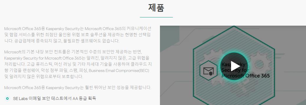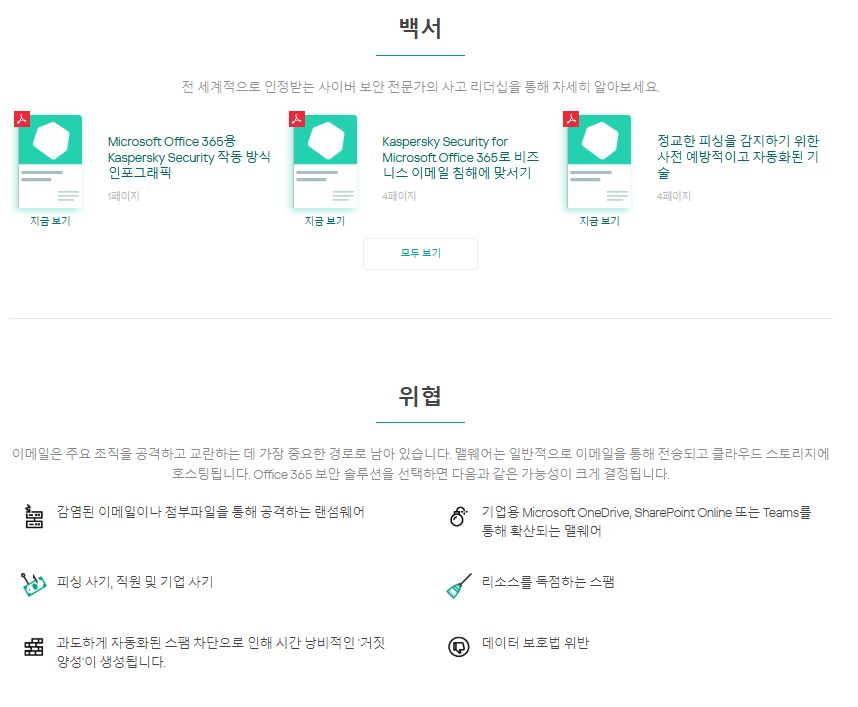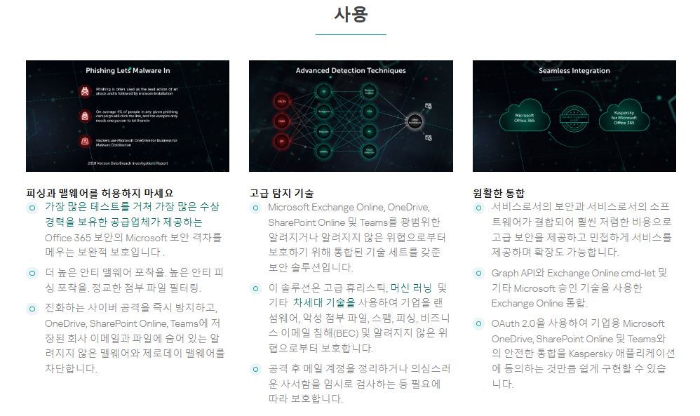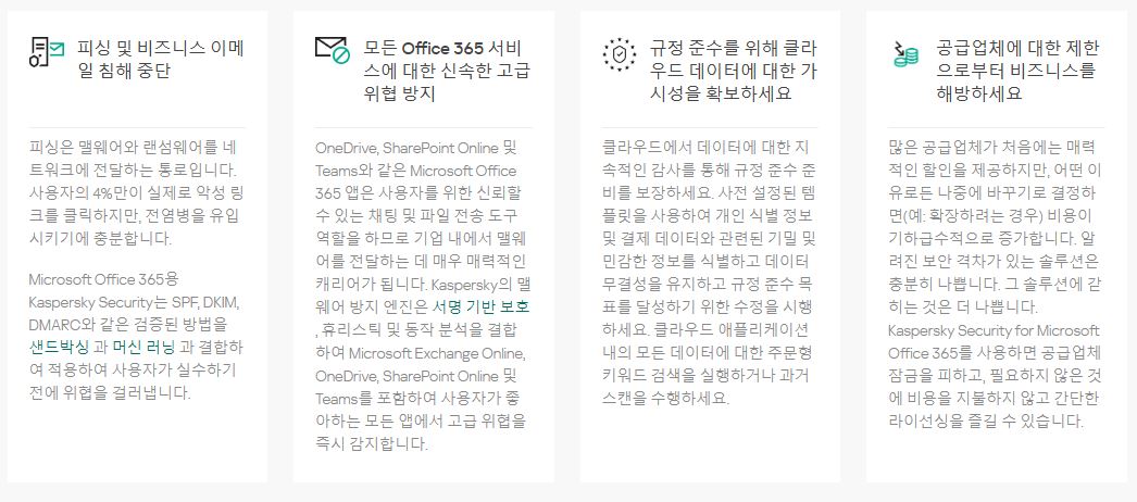 Microsoft Office 365용 Kaspersky Security는 Microsoft Office 365의 커뮤니케이션 및 협업 서비스를 위한 최첨단 올인원 위협 보호 솔루션을 제공하는 현명한 선택입니다.