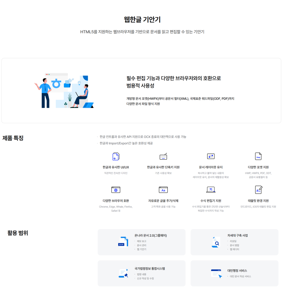 웹한글 기안기는 HTML5 표준을 준수하여 개발되었으며 ActiveX와 같은 플러그인 설치 없이 웹 환경에서 사용할 수 있는 문서 솔루션으로 사용자가 웹 브라우저에서 편리하게 문서를 읽고 편집할 수 있도록 도와줍니다. 웹한글 기안기는 Chrome, Edge, Whale과 같은 주요 브라우저를 지원하고, 한컴오피스 한글 프로그램과 호환되며, 한글 문서뿐만 아니라 PDF, XML, ODT와 같은 개방형 문서 형식을 지원합니다. 웹한글 기안기 개발 가이드에서는 기존 시스템에 웹한글 기안기를 도입하거나 이미 도입한 환경에서 활용할 수 있는 API를 제공합니다. 다양한 서버 환경을 지원하고, 기존 시스템과 손쉽게 연동되고, 필터 서버를 통해 문서를 변환하고, 외부 서버와 통신할 수 있습니다. 또한 한글 파일을 웹 브라우저에서 확인, 편집, 저장할 수 있는 API를 살펴보고 예제 활용 페이지에서 동작을 직접 실행해볼 수 있습니다.